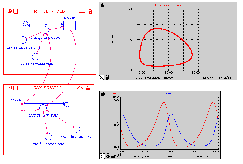 Suppose the predator species is wolves and the prey species is moose as on Isle Royale in Lake Superior. Click once on the picture to see an enlarged, more readable version. Notice that the populations cycle, with the predator peaking right after the prey. Competition in the Prey (1930s): The primary objection to the LV Model was that the prey (x) would increase without bound if the predators died out. What if competition among the prey is also incorporated?