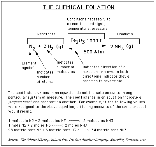 On some occasions, a variety of information will be written above or below the arrows. This information, such as a value for temperature, shows what conditions need to be present for a reaction to occur. For example, in the graphic below, the notation above and below the arrows shows that we need a chemical Fe2O3, a temperature of 1000° C, and a pressure of 500 atmospheres for this reaction to occur.
