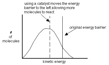 the reaction unchanged. As mentioned earlier, catalysts help lower the activation energy as shown in the following graph. They do this by changing the reaction mechanism.
