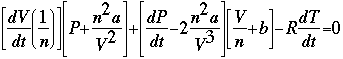As you can see, the Van der Waals equation is quite complex. It is not possible to solve it algebraically, so a numerical method must be used. The Newton-Raphson Method is the easiest and most dependable way to solve equations like this, even though the equation and its derivative seem quite intimidating. Depending on the conditions under which you are attempting to solve this equation, several of the variables may be changing. So, it may be necessary to use partial derivatives. For the purposes of this example, we are assuming that pressure, temperature, and volume are the only things changing, and that these values are all functions of time. This avoids the use of a partial derivative; we simply differentiate all variables with respect to time, as shown above. Some algebraic manipulation of the equation and/or its derivative may be needed depending on the specific problem to be solved. It is assumed that all of the variables but one are specified; that variable is used in the expression for "xn+1" that Newton's method uses. Performing Newton's method on this equation successfully would give a value of that variable which gives a solution when the other variables are held constant at the values you specified. Newton's Method Equation Solver: An Online Interactive Tool