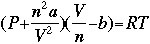 The Newton-Raphson method does not always work, however. It runs into problems in several places. First, consider the above example. What would happen if we chose an initial x-value of x=0? We would have a "division by zero" error, and would not be able to proceed. You may also consider operating the process on the function f(x) = x1/3, using an inital x-value of x=1. Do the x-values converge? Does the delta-x decrease toward zero (0)? So, how does this relate to chemistry? Consider the van der Waals equation found in the Gas Laws section of this text. Assuming that we have a set number of moles of a set gas, not under ideal conditions, we can use the Newton-Raphson method to solve for one of the three variables (temperature, pressure, or volume), based on the other two. To do this, we need to use the van der Waals equation, and the derivative of this equation, both seen below.