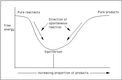 Where: ΔG is change in free energy A pop-up calculator is available to calculate the enthalpy and Gibbs free energy changes in reactions. Given a constant temperature and pressure, the direction of any spontaneous change is toward a lower Gibbs free energy. The graphic below shows that during a reaction, the amount of free energy decreases until the reaction is at equilibrium. If the reaction goes towards completion, the free energy minimum occurs very close to the pure products part of the curve. In other words, the curve moves depending on the conditions of the reaction.