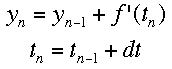 If f'(t) is the change over time at a given time, and a is the time when the tangent is being drawn, then the equation of a tangent line at any time is f'(t)*(t-a)+f(a). Using the same idea, we can see that the following equations represent the change in y and time over a given space of time. The subscripts represent the number of steps that have been taken so far. Using this process, Euler's method "steps" along the curve.