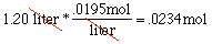 .0234 moles Don't let all the technical terms get in the way; we have 1.2 liters of stuff to convert to moles: